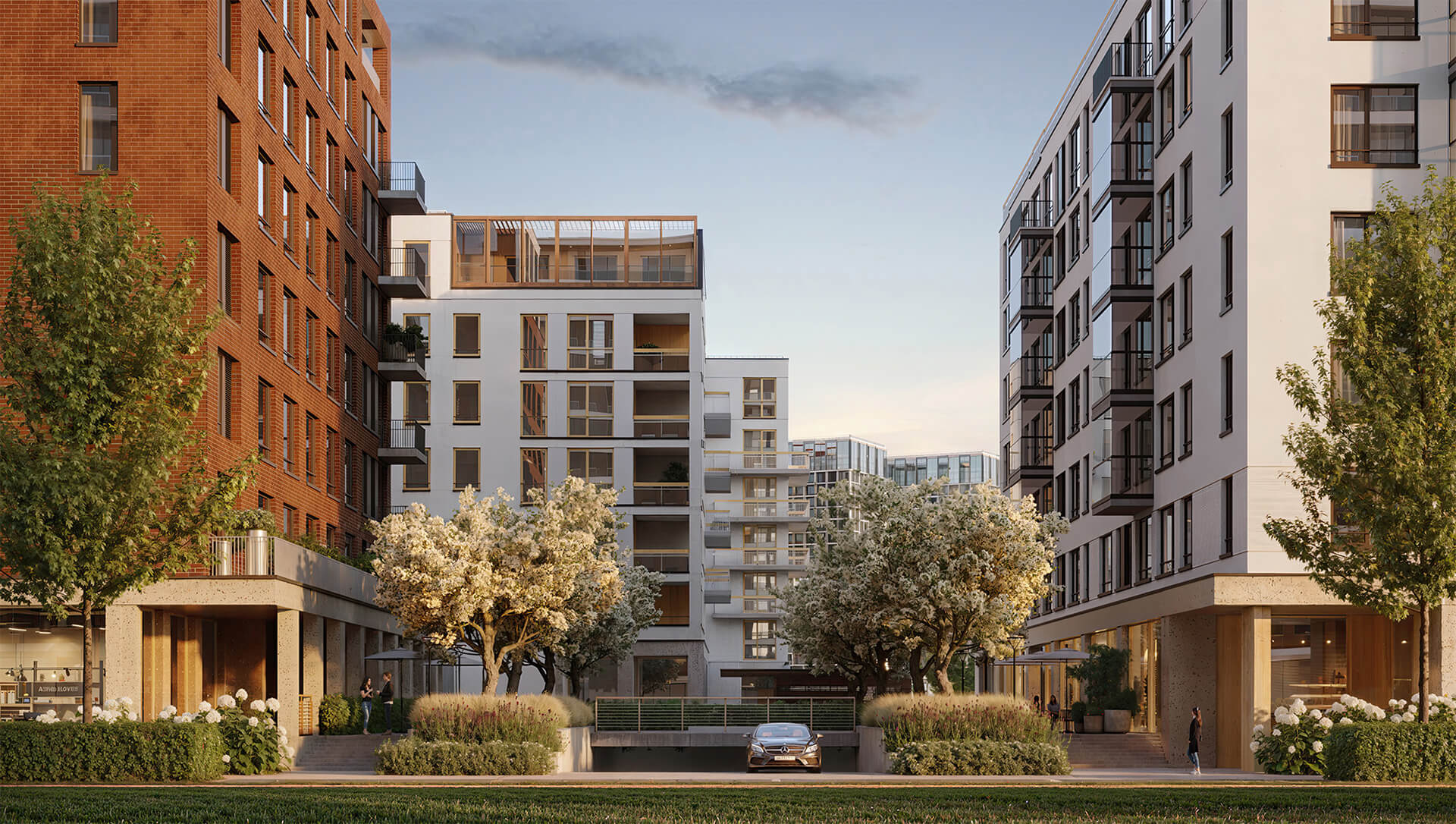 Архитектурно-дизайнерская концепция также включает общественные зоны — двухуровневое лобби, уютные дворики, зоны для общения и отдыха. В архитектуре комплекса воплощены идеи устойчивого развития — энергоэффективные технологии, экологичные фасадные решения, а также оптимальная ориентация зданий по сторонам света. Это жилой комплекс, где архитектура — не просто внешний облик, но основа для комфортной и здоровой жизни.