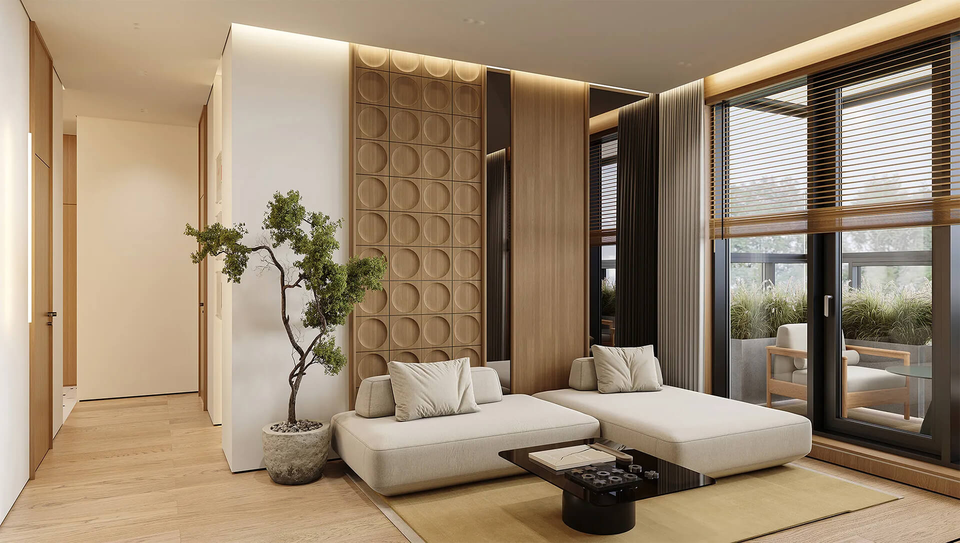 Детально продуманный интерьер лобби включает даже такие мелочи, как мягкие кресла для ожидания, зона с книгами и пространства для неформального общения. Использование натуральной отделки, дерева и текстурированного камня подчёркивает экологичность и качественный подход. При этом лобби остаётся функциональным: здесь удобно принимать посылки, встречать гостей и организовывать краткие деловые встречи, не выходя из дома.