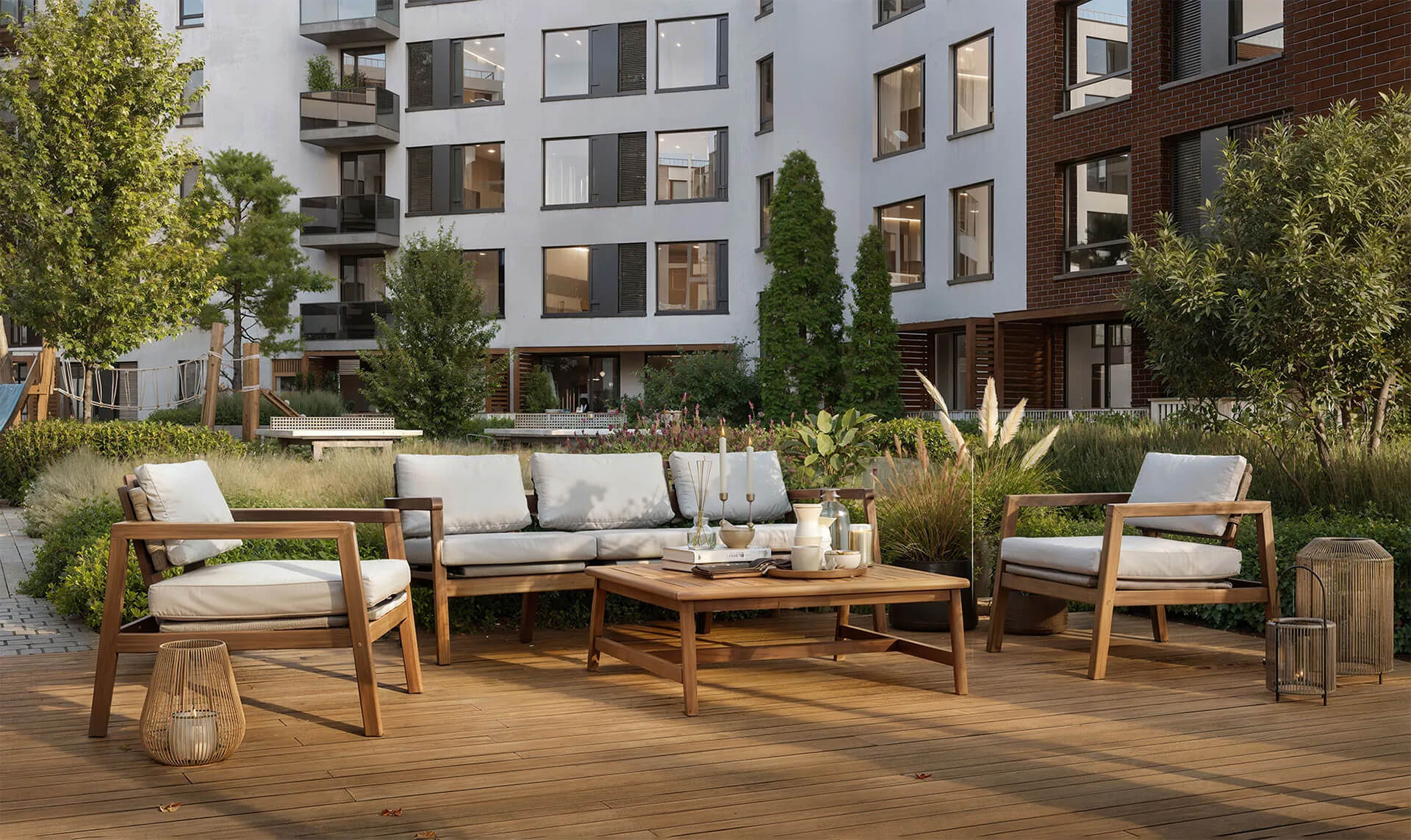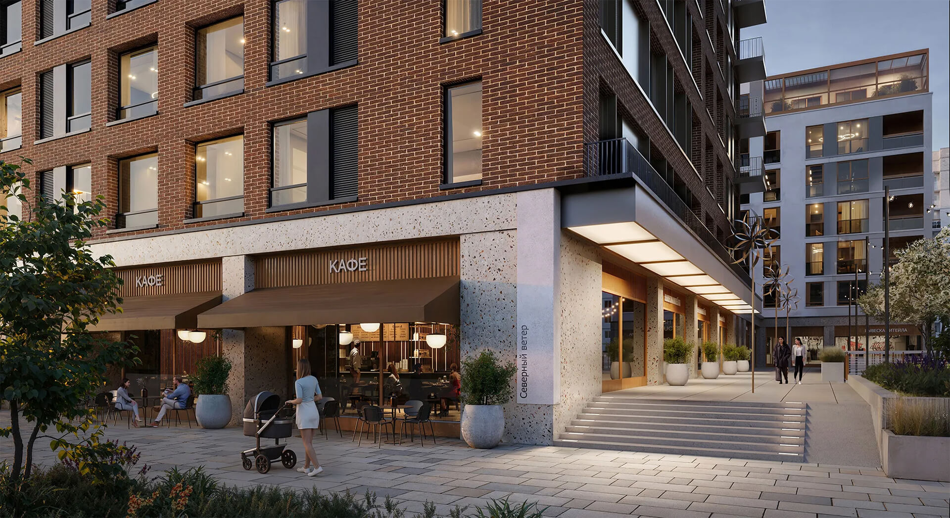 Внешнее пространство «Северного ветра» продумано до каждой детали: здесь комфортно гулять, отдыхать и заниматься спортом. На территории предусмотрены благоустроенные аллеи, газоны и цветники, места для отдыха на свежем воздухе, детские игровые комплексы разработаны с учётом безопасности и экологичности. Входные площадки на уровне земли плавно переходят к внутренним дворикам, создавая ощущение единого целого.
