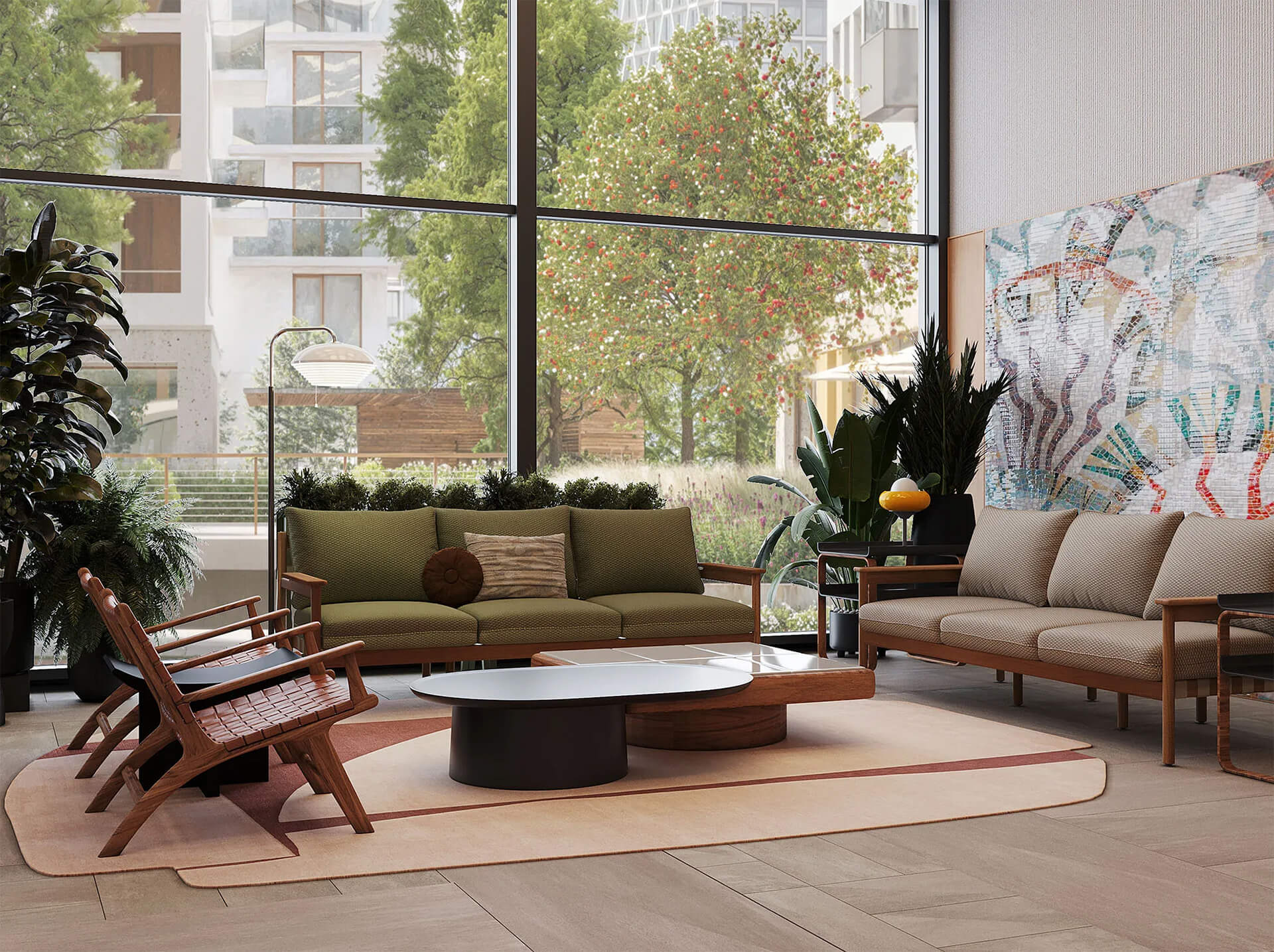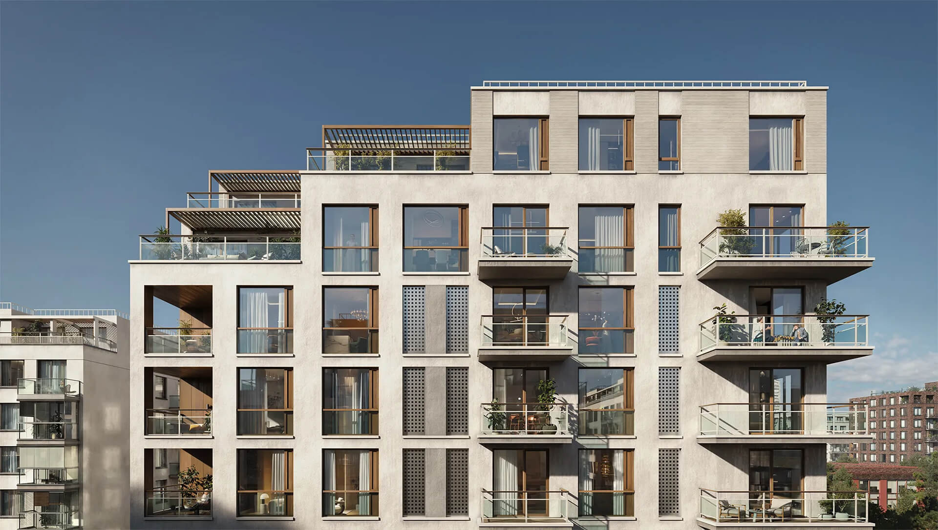 Архитектурно-дизайнерская концепция также включает общественные зоны — двухуровневое лобби, уютные дворики, зоны для общения и отдыха. В архитектуре комплекса воплощены идеи устойчивого развития — энергоэффективные технологии, экологичные фасадные решения, а также оптимальная ориентация зданий по сторонам света. Это жилой комплекс, где архитектура — не просто внешний облик, но основа для комфортной и здоровой жизни.