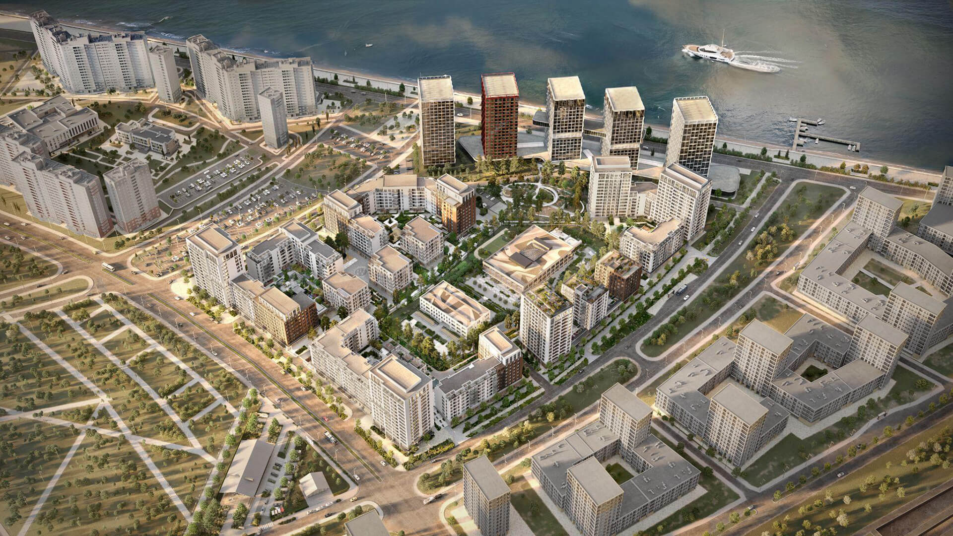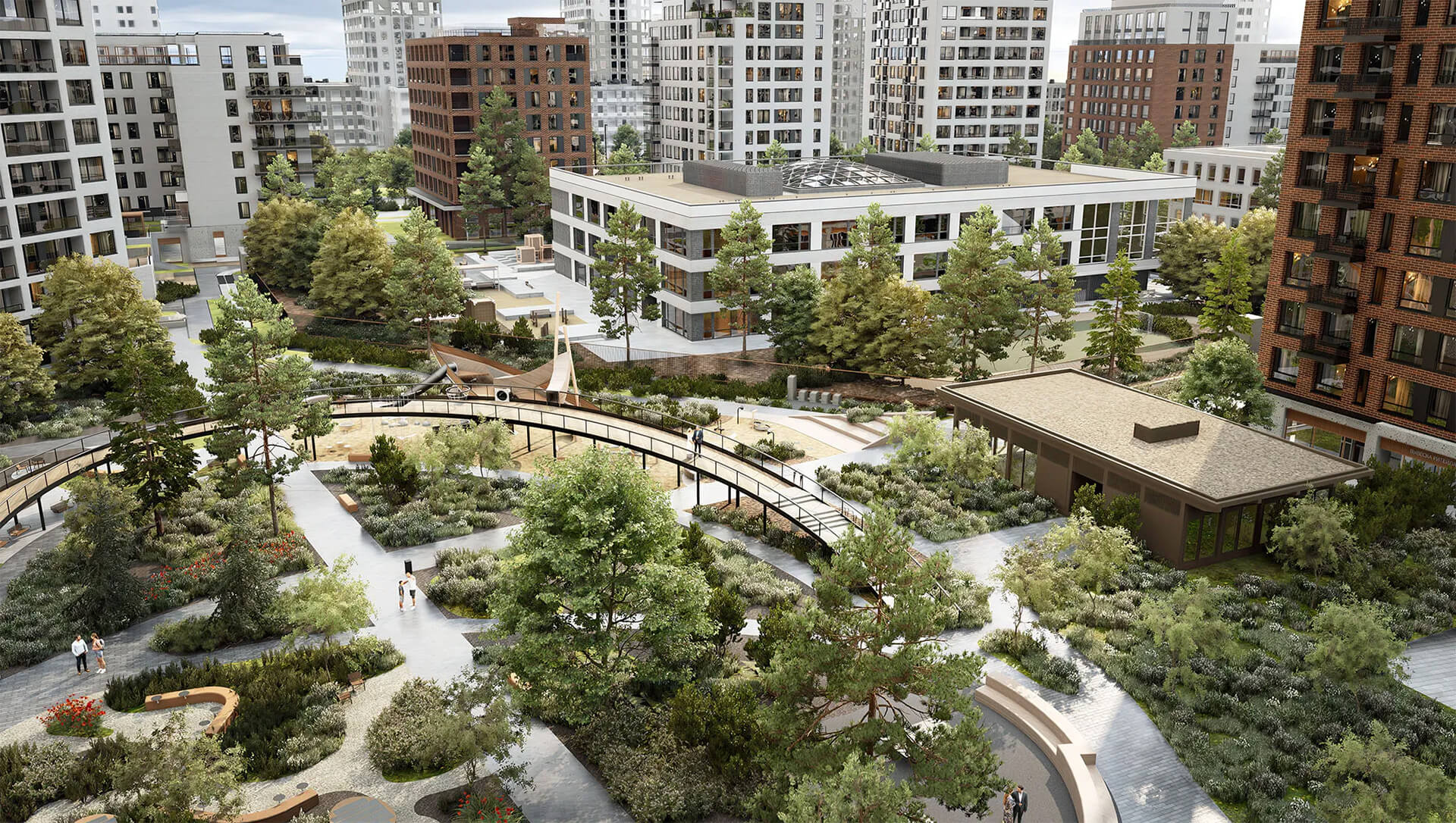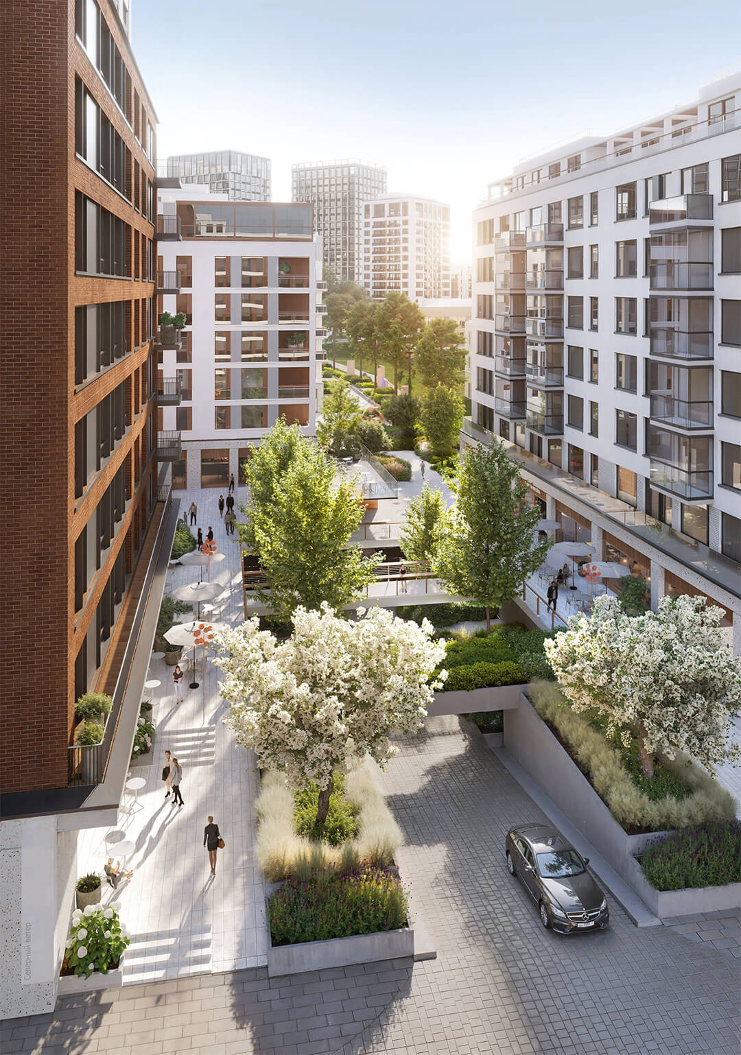 Для любителей спорта и активности запроектированы спортивные площадки и зоны воркаута, зона прогулок с беговыми и велодорожками по периметру квартала. Оригинальные арт-объекты, скамьи и уютные уголки для бесед создают атмосферу живого сообщества. Пространство адаптировано под разные сезоны — предусмотрена зимняя подсветка и освещение аллей, круглогодичная комфортная среда.