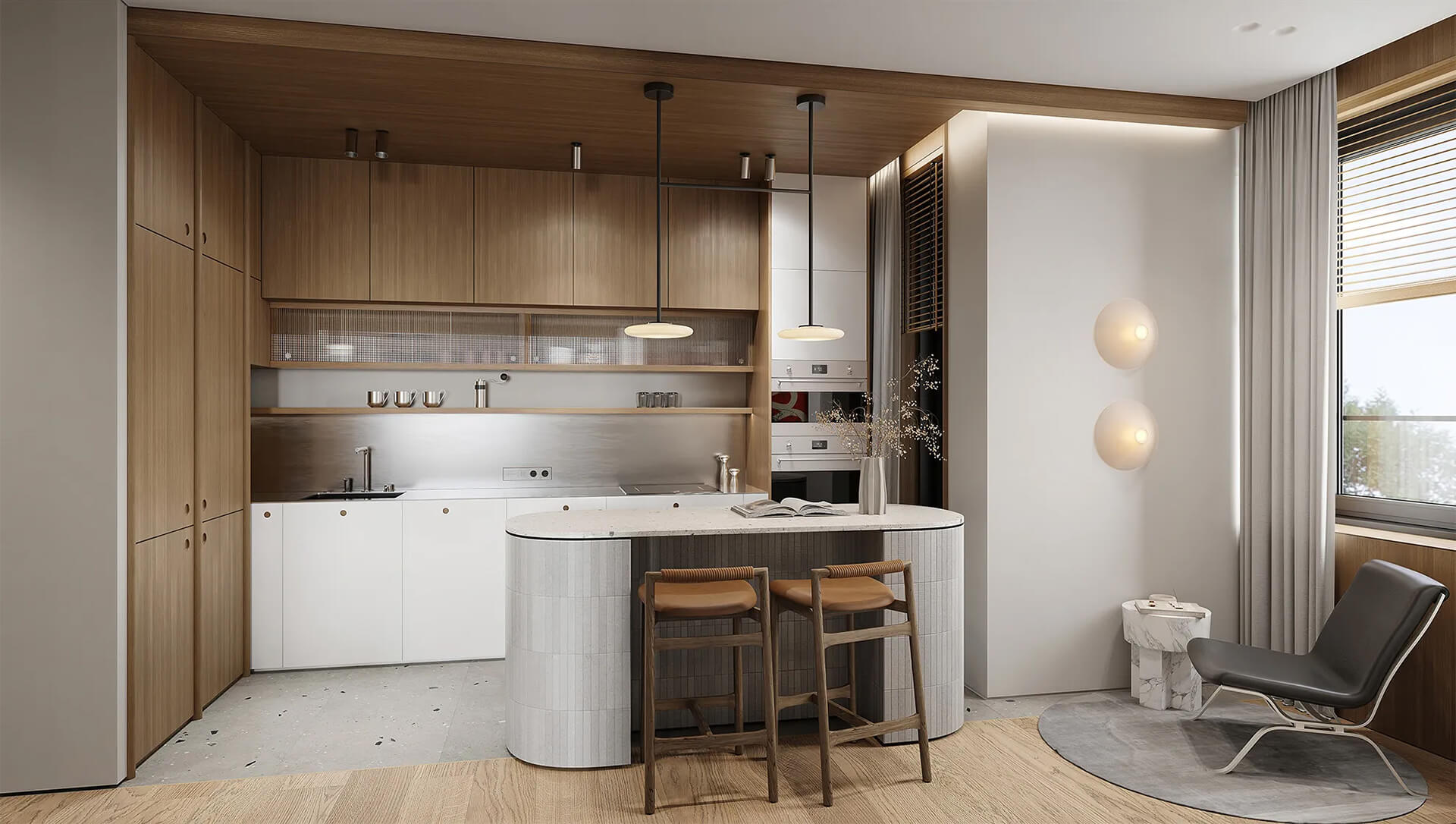 Детально продуманный интерьер лобби включает даже такие мелочи, как мягкие кресла для ожидания, зона с книгами и пространства для неформального общения. Использование натуральной отделки, дерева и текстурированного камня подчёркивает экологичность и качественный подход. При этом лобби остаётся функциональным: здесь удобно принимать посылки, встречать гостей и организовывать краткие деловые встречи, не выходя из дома.
