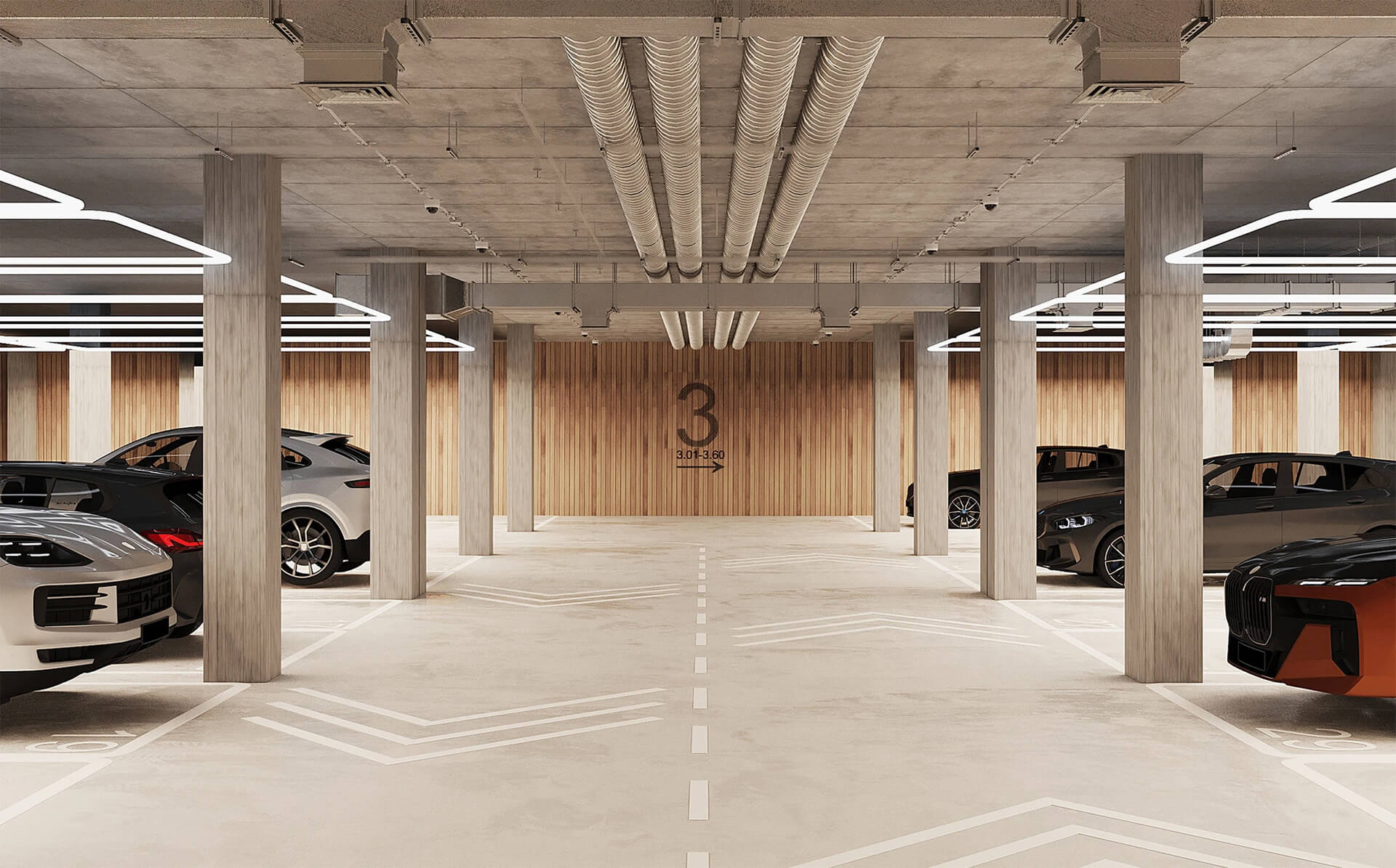 Паркинг выдержан в минималистичной стилистике, гармонирующей с архитектурой комплекса. Он оснащён системой видеонаблюдения, освещением и вентиляцией. Это гарантирует безопасность, комфорт и контроль для жильцов. Специализированные места — для людей с ограниченными возможностями, семей с колясками и велогонок — расположены в шаговой доступности от входов.